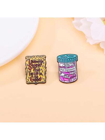 2pcs English Book Style Pin Enamel Cartoon Medicine Bottle Shape Brooch Clothing Decoration Alloy Dripping Oil Thorn Butterfly Buckle Horse Pin Badge - Multicolor - View 2
