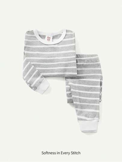 Cozy Pixies 2pcs Baby Boy Striped Round Neck Top And Long Pants Snug Fit Pajama Set, Grey & White - Grey - View 1