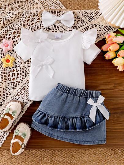 2pcs Baby Girl Set: White Short Sleeve T-Shirt With 3D Bow Decor, And Denim Skirt With 3D Bow Elastic Waist, Includes Bow Headband - White - View 1