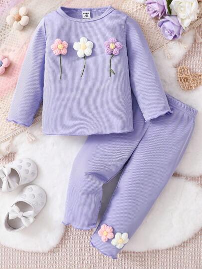 SHEIN 2pcs Baby Girls' Purple Solid Color Flower Decorated Casual Comfortable Homewear Set, Long Pants & Long Sleeve Top - Purple - View 1