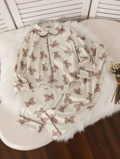 2pcs Girls Bear Print Long Sleeve Pajama Set, Cute Sleepwear Outfit Suitable For 4-7 Years Old Girls Everyday Wear - Beige - View 1