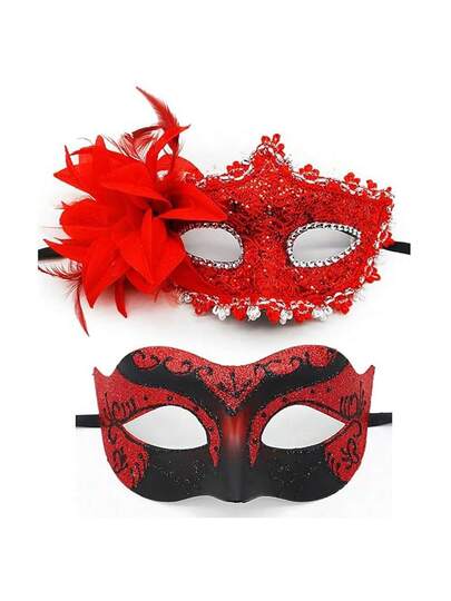 2pcs Lace Couple Masks, Masquerade Ball Masks, Bridal Costume Eye Masks, Venetian Party Masks, Suitable For Valentine's Day, Christmas, New Year Party, Costume Party (Includes Artificial Feathers) - Multicolor - View 1