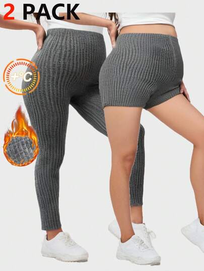 SHEIN 2pcs Maternity Casual Minimalist Elastic Rib-Knit Leggings - Grey - View 1
