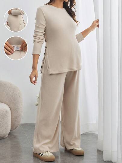 SHEIN 2pcs Maternity Outfit, Straight Pants Suit - Apricot - View 1
