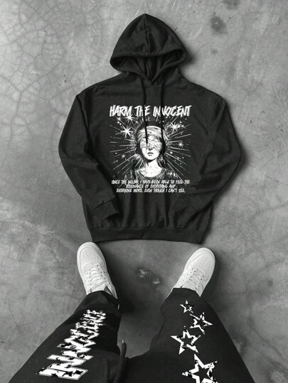 PAVTROS Manfinity Streetrush 2pcs Men's Casual Slogan Print Hoodie And Drawstring Waist Printed Star & Letter Sweatpants Set - Black - View 1