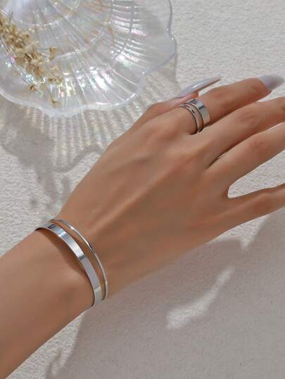 2pcs Minimalist Copper Geometric Wavy Bangle Bracelet & Ring Jewelry Set, For Women Daily, Party, Wedding, Mother's Day Gift - Silver - View 1