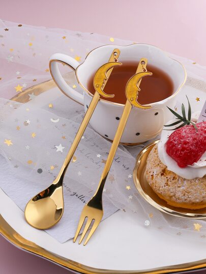 2pcs Moon & Star Decor Stainless Steel Dining Set - Gold - View 1