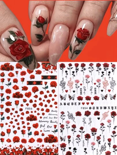 2pcs Nail Stickers With Butterfly Rose Flower Snake Red Lips Design DIY Suitable For Ladies Nail Art Decals Nail Art Decorations - Hot Pink - View 1