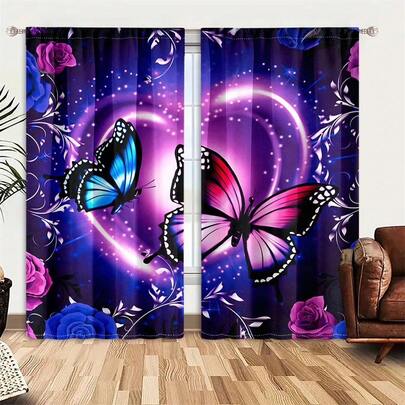 2 tấm rèm cửa màu tím họa tiết bướm, cản sáng một phần, thiết kế không cần khoan lỗ, kiểu dáng huyền ảo cho phòng khách, nhà bếp, trang trí nhà cửa, chất liệu polyester, có thể giặt máy/giặt tay.