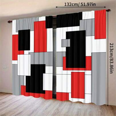 2pcs Red, White, Black & Gray Geometric Patchwork Pattern High Definition Digital Print Sheer Curtains, Made Of Fade-Resistant Polyester, Machine Washable, Suitable For Bedroom And Living Room Decoration - Multicolor - View 1