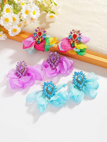 2pcs Retro-Chic Bohemian Style Rhinestone Fabric Flower Earrings, Fashionable Colored Rhinestone Mesh Flower Earrings, Elegant Earrings For Ladies At Evening Parties And Balls. - Multicolor - View 11