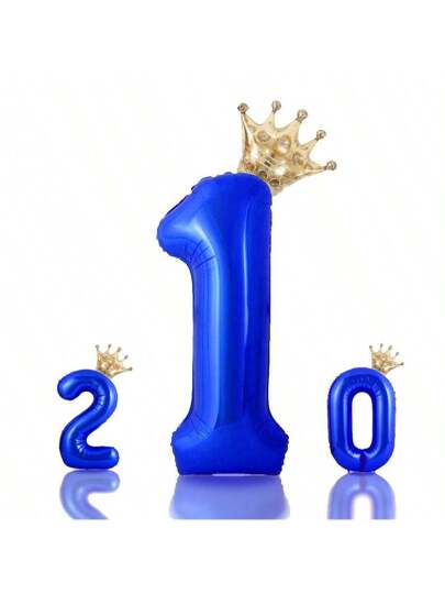 2pcs Royal Blue Color Large Size Number & Mini Crown Shape Aluminum Foil Balloons (0-9 Optional) With 1pc Glue Dot And 1 Straw For Anniversary Celebration, Birthday Party, New Year Decoration, Back To School Valentine Day - Royal Blue - View 1