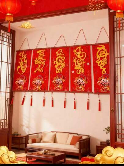 2pcs/Set 2026 Vietnamese New Year Cartoon Hanging Decor, 3D Prosperity Character, Living Room Wall Decoration, 5 Styles With Wooden Frame - Red - View 1