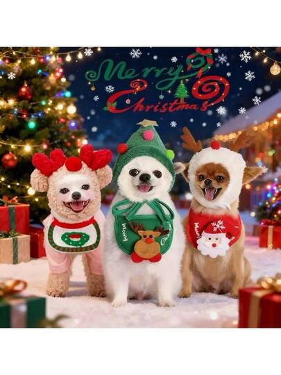 2pcs/Set Christmas Pet Hat & Bib Set, Cat Clothes & Dog Bibs For Winter, Fits 8-15 Lbs Pets - Multicolor - View 1