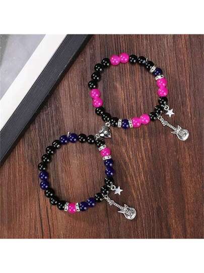 2pcs/Set Couple Bracelets With Guitar & Crown Design, Pink & Blue Beaded Bracelets With Heart Shaped Stone Decoration,Friendship, Distance & Promise Bracelets, Fashion Jewelry Gift For Best Friends - Multicolor - View 1