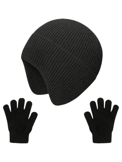 2pcs/Set Kids Winter Warm Earflap Hat & Gloves, Thick Knitted Beanie - 2pcs - View 1