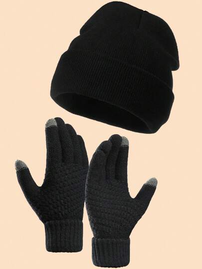 2pcs/Set Men's Winter Hat And Gloves, Windproof Ski Hat Knit Beanie Cap, Couples' Casual Hat Family Cap, Black - Black - View 1
