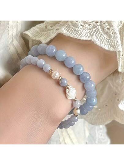 2pcs Set Of Stacked Sea Blue Camellia Beaded Bracelets, Gifts For Women, Girlfriends, Students, Holiday & Summer. Prosperity & Good Luck Sea Blue Camellia Beaded Bracelet Set, Handmade Beaded Bracelet, Suitable For Stacking And Accessory Matching. Fashionable Women's Bracelet, Gifts For Valentine's Day, Mother's Day, Birthday - Multicolor - View 1