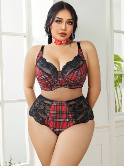 2pcs Set Plus Size Milk Silk Printed Contrast Lace Bra, Lift - Multicolor - View 1