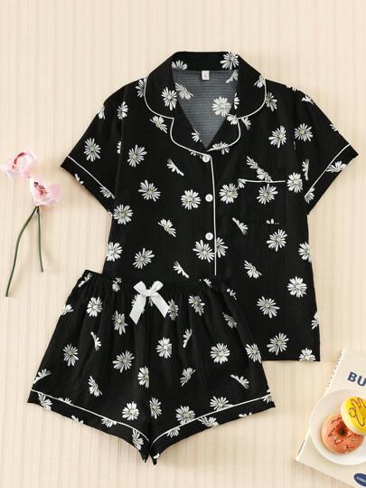 2pcs/Set Women's Daisy Printed Summer Pajama Set, Short Sleeve Button-Down Shirt And Shorts, Casual Loungewear For Summer.,Two Pieces Set - Black - View 1