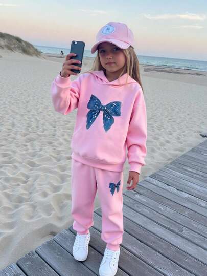 2pcs/Set Young Girls Bow Print Hooded Long Sleeve Sweatshirt & Pants Set - Pink - View 1