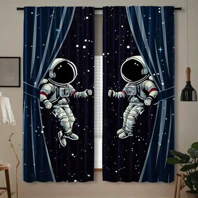 2pcs Space Astronaut Blackout Curtains For Bedroom Living Room - Modern Polyester Pongee Rod Pocket Drapes - Semi-Sheer, Machine Washable, Roller Embossing Cosmic Adventure Theme Window Treatments - Unlined Room Darkening Panels For Home Decoration - Multicolor - 2pcs - View 2