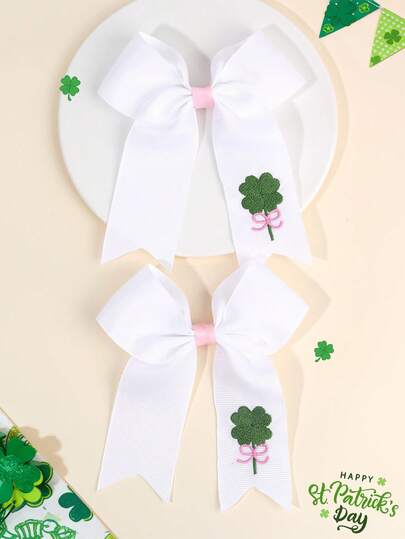 2pcs St. Patrick's Day Clover Embroidered Hair Bows For Girls Simple White Bow Alligator Clips With Tail Adorable Shamrock Hair Clips Parade Barrettes Cute Sweet Clover Hairpins Teens Hair Accessories - Multicolor - View 1