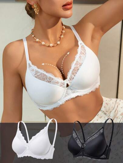 2pcs Thin Padding, Underwire, Smooth Lace Adjustable Comfort Brassiere - Multicolor - View 1