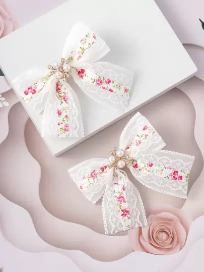 2pcs Teen Girls Floral Print Bow Decor Hair Clip - Multicolor - View 1