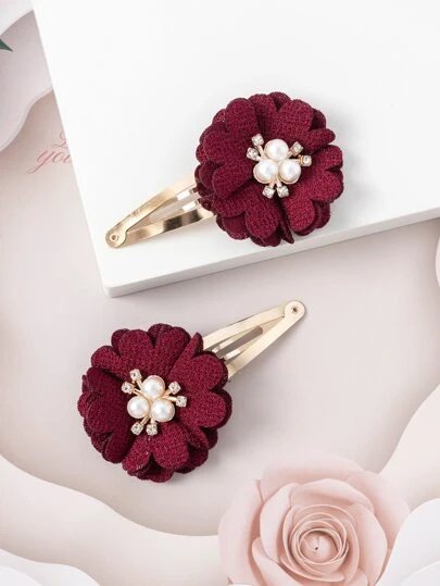 2pcs Toddler Girls Flower Decor Fashion Hair Clip - Burgundy - View 1