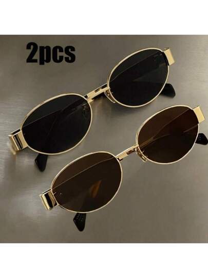 2pcs Unisex Retro Oval Metal Fashion Eyeglasses, Classic Decor Eyewear For Outdoor Travel Beach Holiday Casual Daily Wear, Driving - Multicolor - View 1
