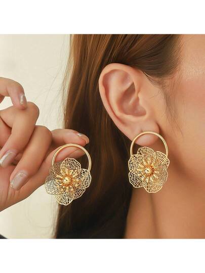 2pcs Vintage Hollow Floral Design Statement Earrings For Women, Suitable For Daily Wear And Formal Dresses - Yellow Gold - View 1