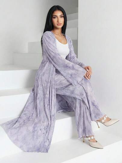 Bộ 2 món gồm áo dài tay in họa tiết toàn thân và quần cạp chun cho nữ.