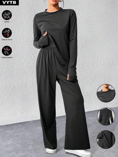 2pcs Women Long Sleeve Round Neck T-Shirt Top & Loose Comfortable Casual Pants Set - Black - View 1