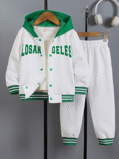 SHEIN 2pcs Young Boy Solid Color Patchwork Front Button Long Sleeve Hoodie And Pants Set - White - View 1