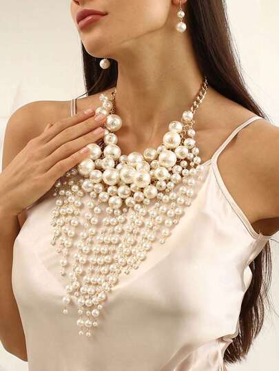 2pcs/Set Fashionable European Style Faux Pearl Necklace & Earrings Set With Heavy Duty Chain, Multi-Layer Fringe Pearl Necklace Set With Clothing - White - View 1