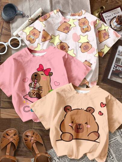 SHEIN Leap Crew 2pcs/Set Cute Capybara, Pink Anime, Heart & Bow Print Casual Minimalist Short Sleeve Crew Neck T-Shirt, Summer Tween Girl, School, Campus, College - Multicolor - View 1