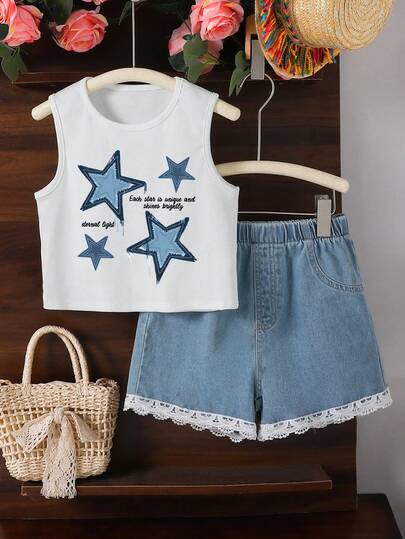 2pcs/Set Girls Star Print Round Neck Ribbed Vest And Lace Trim Denim Shorts Set, Casual Style, Spring/Summer - Multicolor - View 1
