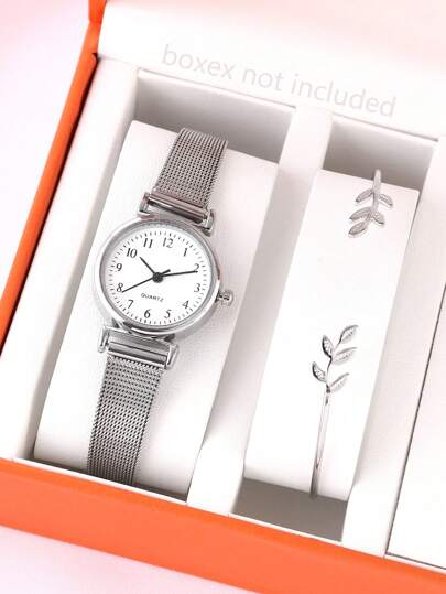 2pcs/Set Including One Simple Ladies' Mesh Strap Quartz Watch And One Leaf Bracelet, Suitable For Daily Wear And Festival Gift For Girls - Silver - View 1