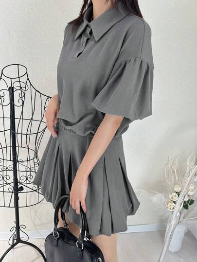 FRIFUL 2pcs/Set Women Solid Color Short Sleeve Shirt And Mini Skirt - Grey - View 1