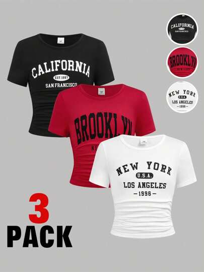 SHEIN Girlism 3-Pack Tween Girls Casual Round Neck Fitted Waist Ruched Front Print T-Shirts In Red, White And Black, School, Campus, College - Multicolor - View 1