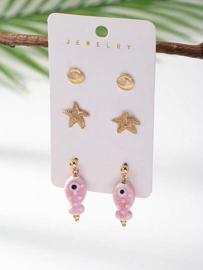 3 Pairs Seaside Beach Style Starfish Shell Ceramic Fish Summer Earrings Set For Women - Multicolor - View 1