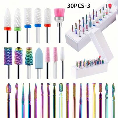 30pcs Ceramic Diamond Nail Drill Bit Set - Tungsten Carbide Cuticle Remover, Suitable For Acrylic, Gel Manicure, Pedicure, Home Salon Use - Multicolor - View 1