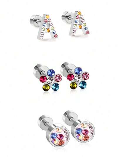 3pairs/Set Inlaid Rhinestone 18k Gold Plated Stainless Steel English Letter A Design Earrings With Six-Color Flower & Cylinder & Screw Back For Couples, Daily & Party & Gift Accessory - Mixed - View 1
