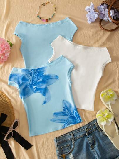 Bộ 3 áo thun hở vai ôm sát cho bé gái, phong cách du lịch, nhiều màu