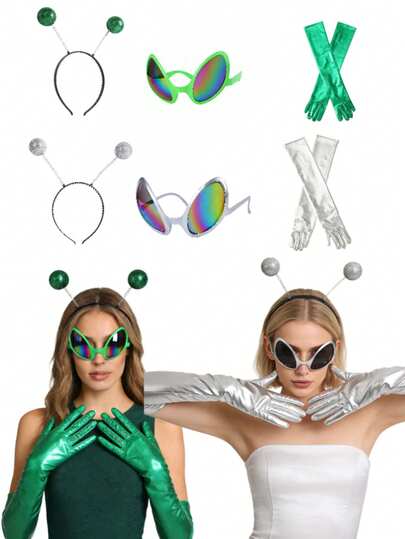 3pcs Alien Costume Set - Includes Gloves + Glasses + Headband, Suitable For Parties, Music Festivals, Costume Parties, Role-Playing And Holiday Celebrations - Multicolor - View 1