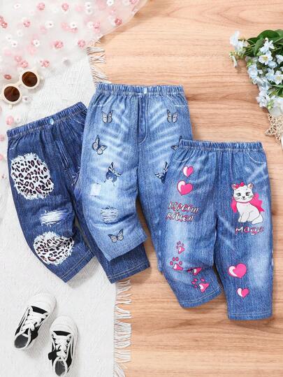 3pcs Baby Girl Fashionable Cute Print Elastic Comfortable Pants Set - Blue - View 1