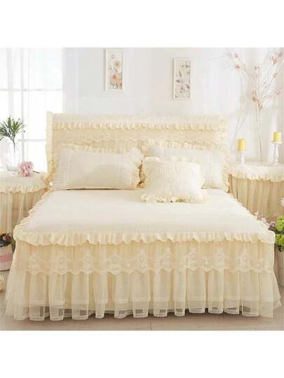 3pcs Bedding Set (1 Bed Skirt + 2 Pillowcases) Princess Style Bed Skirt And Lace Edged Pillowcases, Suitable For Bedroom And Hotel - Beige - View 1