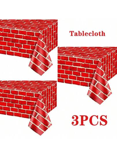 3pcs Disposable Brick Patterned Plastic Tablecloths, 108 X 54 Inches, High Quality Multipurpose Home Party Decoration, Background For School Dorms, Fireplace, Windows, Photography, Party Tables - Red Brick Tablecloth - View 1