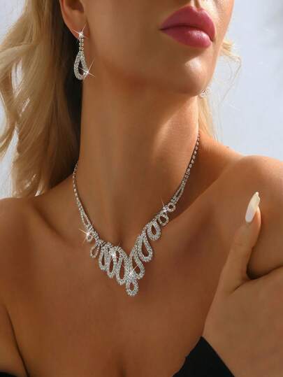 3pcs Elegant Silver Bridal Jewelry Set With Rhinestone Hollowed Claw Chain Necklace And Earrings For Daily Use - Necklace Earring Set - View 1